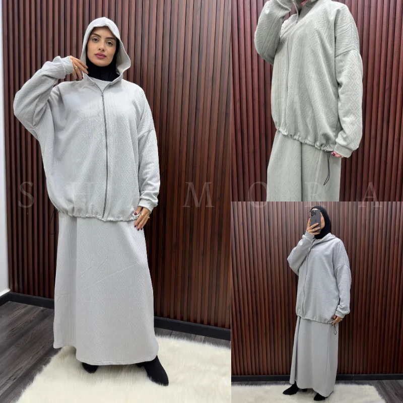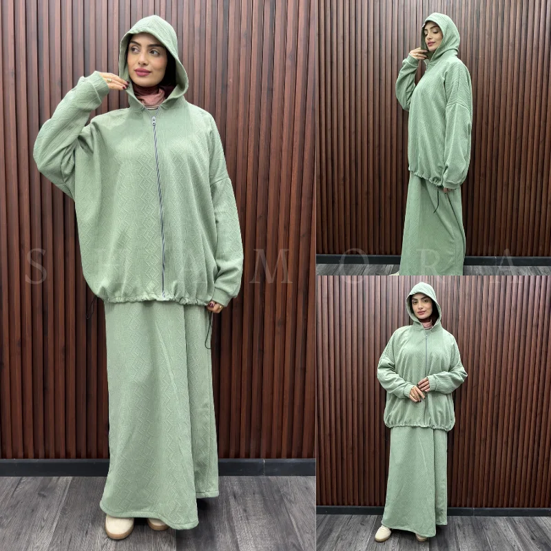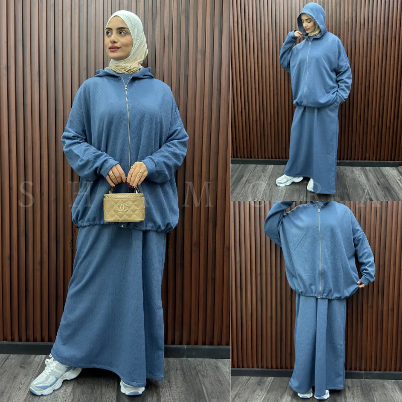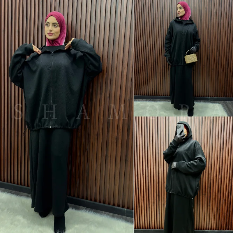 يتكوّن من جكيت بسنسلة + كسوة واسعة ذات أكمام طويلة بقصّة مدروسة تمنحك حرية الحركة وإطلالة محتشمة أنيقة.